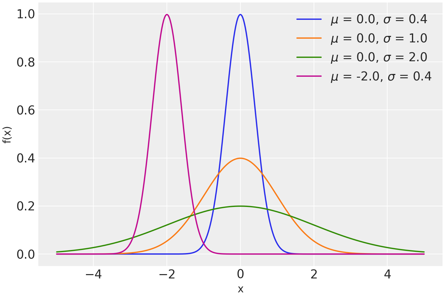 \[f(x \mid \mu, \tau) = \sqrt{\frac{\tau}{2\pi}} \exp\left\{ -\frac{\tau}{2} (x-\mu)^2 \right\}\]Normal distribution can be parameterized either in terms of precision or standard deviation. The link between the two parametrizations is given by