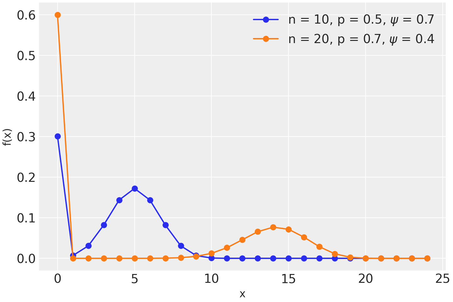 \[\begin{split}f(x \mid \psi, n, p) = \left\{ \begin{array}{l} (1-\psi) + \psi (1-p)^{n}, \text{if } x = 0 \\ \psi {n \choose x} p^x (1-p)^{n-x}, \text{if } x=1,2,3,\ldots,n \end{array} \right.\end{split}\](